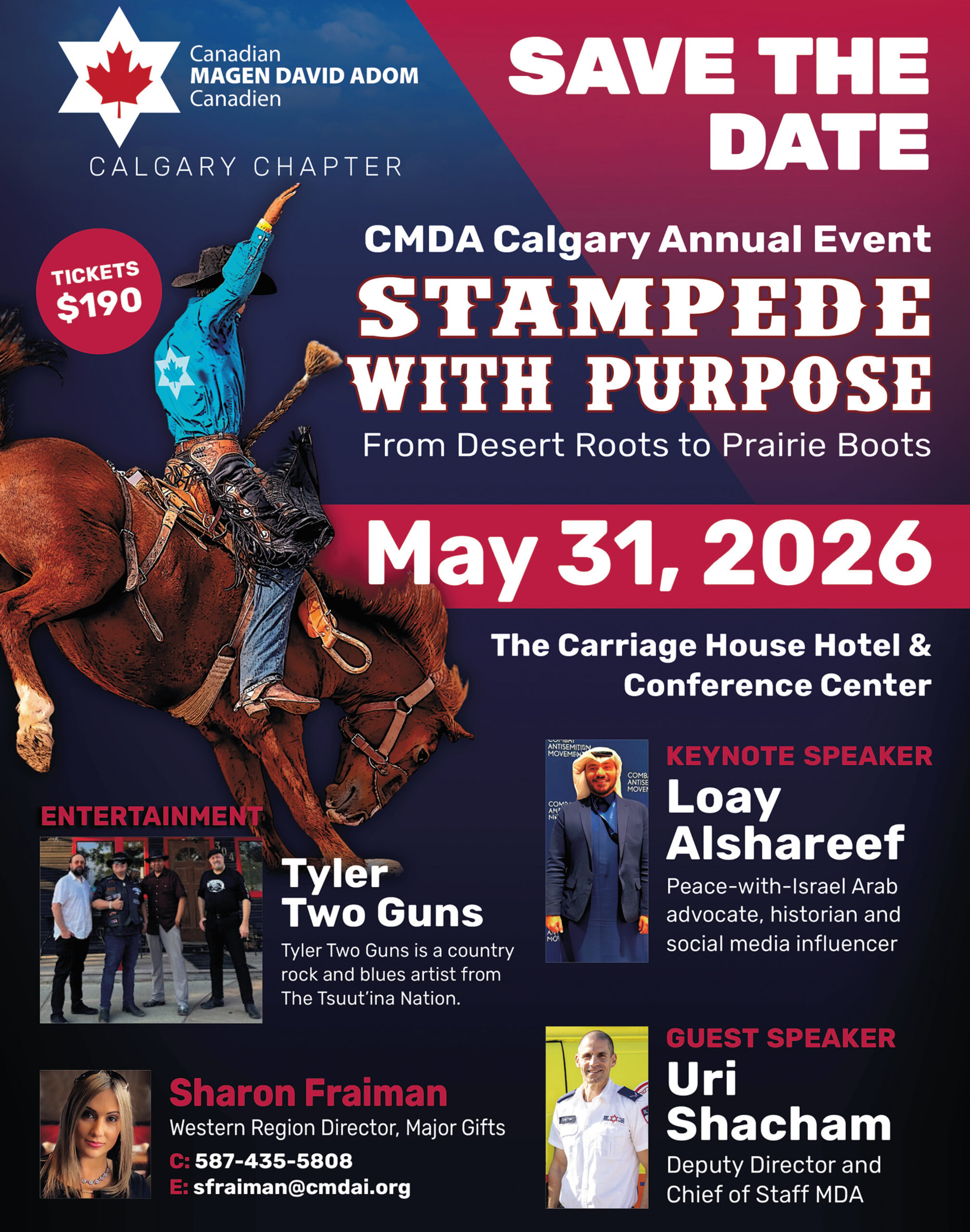 Note: Canadian Friends of Magen David Adom is hosting its annual Thank you Gala Event on May 31 at the Carriage House Hotel and Conference Centre to show appreciation to its many donors and to raise awareness of the exceptional work that Magen David Adom does to save live in Israel. The theme is Stampede with Purpose: From Desert Roots to Prairie Boots and it is going to be an amazing evening featuring great food, excellent entertainment and engaging guest speakers. Sponsorships and tickets are now available – for information contact sfraiman@cmdai.org.