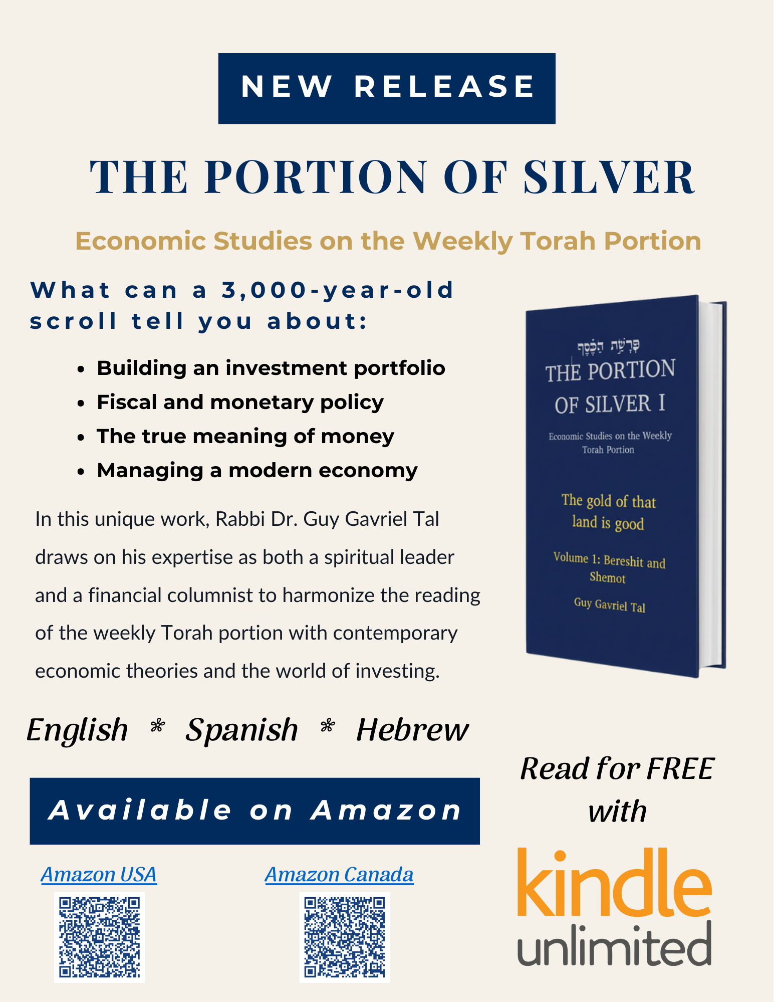 (AJNews) – A new publication, with ties close to home, showcases the spiritual wisdom of a rabbi, and the intellectual scholarship of an academic. Rabbi Dr. Guy Gavriel Tal, of Beth Israel Synagogue in Edmonton, has not only impressively published his innovative synthesis of the realms of theological studies and the social sciences, but he has done so in English, Hebrew, and Spanish translations of A Portion of Silver: The Gold of That Land is Good. This is a two-volume undertaking, and the first installation, which applies a geopolitical-economic analytical lens to Bereshit and Shemot, will certainly spark inquisitive debate in university lecture halls, among Torah scholars, and across dinner tables. The second volume deals with Vayikra, Bamidbar, and Devarim. Although the work would certainly catch the eye of a Jewish reader, the insights also find their footing in the tangible realm – a world where too often money prevails where G-d’s teachings should stand supreme. It is this multifaceted approach to discussion that distinguishes the text as uniquely Jewish, and universally relevant.